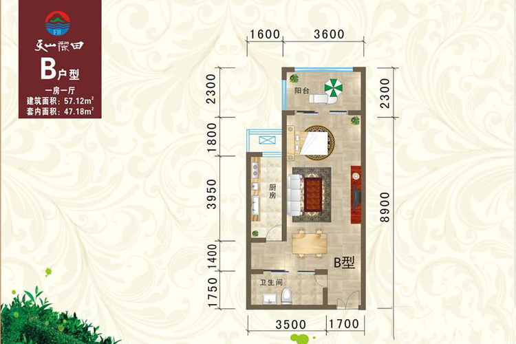 B户型一房一厅建筑面积57平米(建筑面积:㎡)