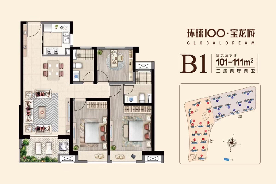 环球100宝龙城住宅推出4套房源,建面为102.6-119.82平米三房户型,总价157-179万/套