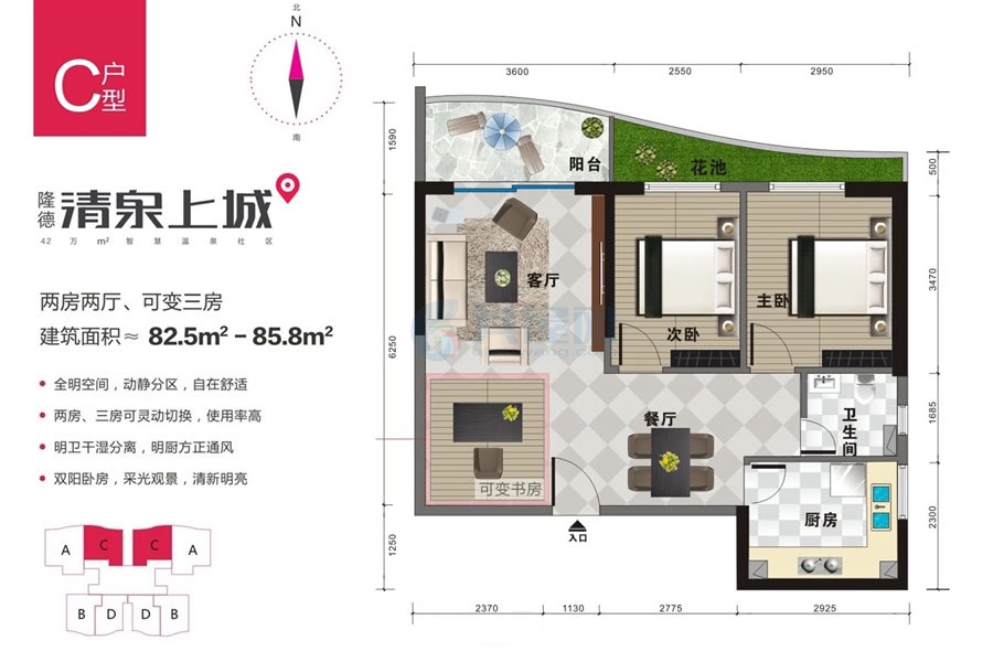 • 主力户型:建筑面积约65㎡一房、76-85㎡两房、109㎡三房