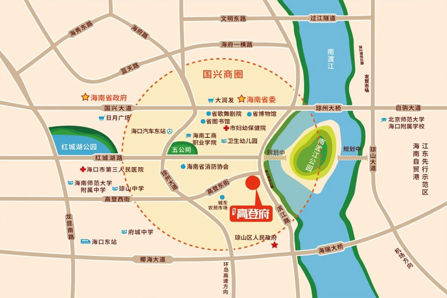 东临滨江路,北临国兴商圈,尽享国兴大润发、红城湖家乐福、源安隆广场,国秀城、日月广场,福地美食街,城东城东农贸市场,第三人民医院,海南现代妇女儿童医院。