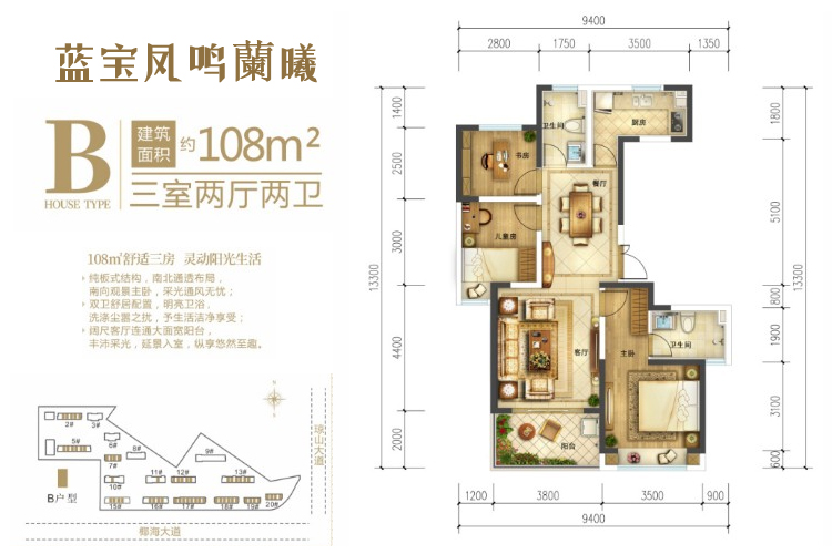 蓝宝凤鸣蘭曦-B户型-建面108平米-三房两厅