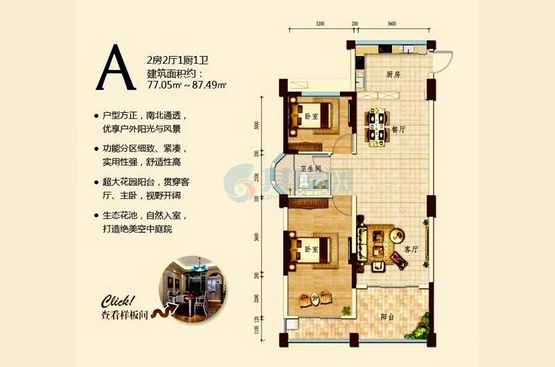 A户型77.05-78.49㎡(建筑面积)两房两厅