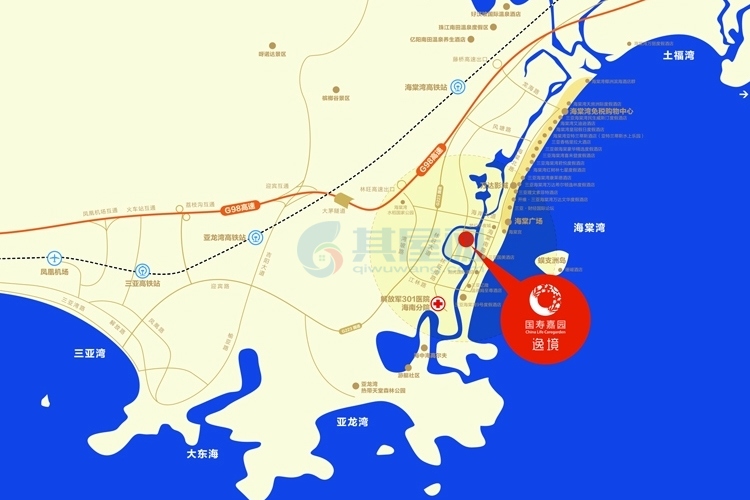 项目距三亚凤凰国际机场30公里,距市区28公里。周边度假生活配套资源丰富:中国人民解放军301医院海南分院具备完善的医疗条件与资源,距离仅2公里,为社区居民与客户提供了医疗安全保障;离三亚国际免税购物广场距离项目仅10公里;32家酒店云集海棠湾沿海一线,人大附中即将进驻,万达影城及文化广场、梦幻娱乐不夜城与社区北侧相邻;南田温泉距社区仅15公里。