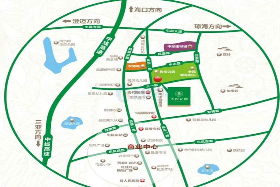 天悦花园位于海南岛屯昌县,地处南渡江南岸,五指山北麓,海口经济圈内,屯昌县为低山丘陵地带,属热带季风气候,阳光充足,气候适宜,年平均气温23℃,年平均日照时数 1900—2100 ;年均降雨量1900—2400毫米。