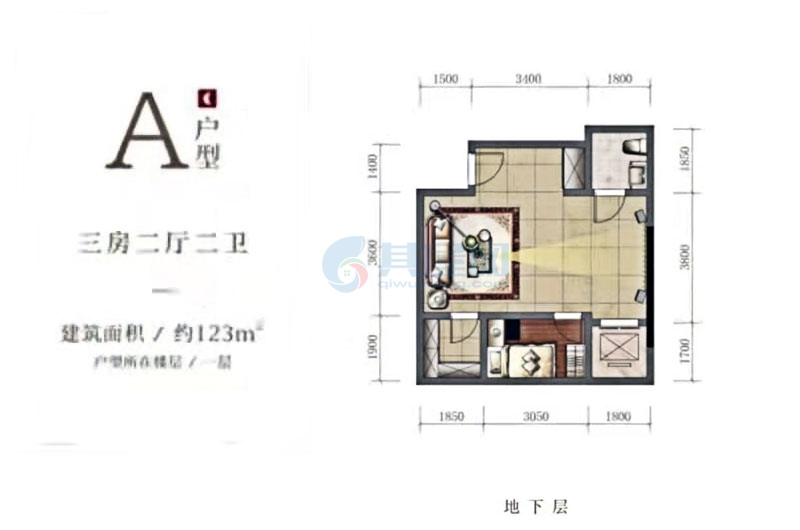 墅级洋房A户型-建面约123㎡-3房2厅1厨2卫-地下层