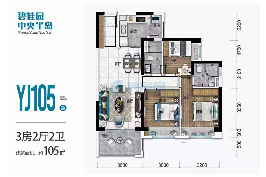 爱琴海-YJ105户型-建面约105平-三房两厅