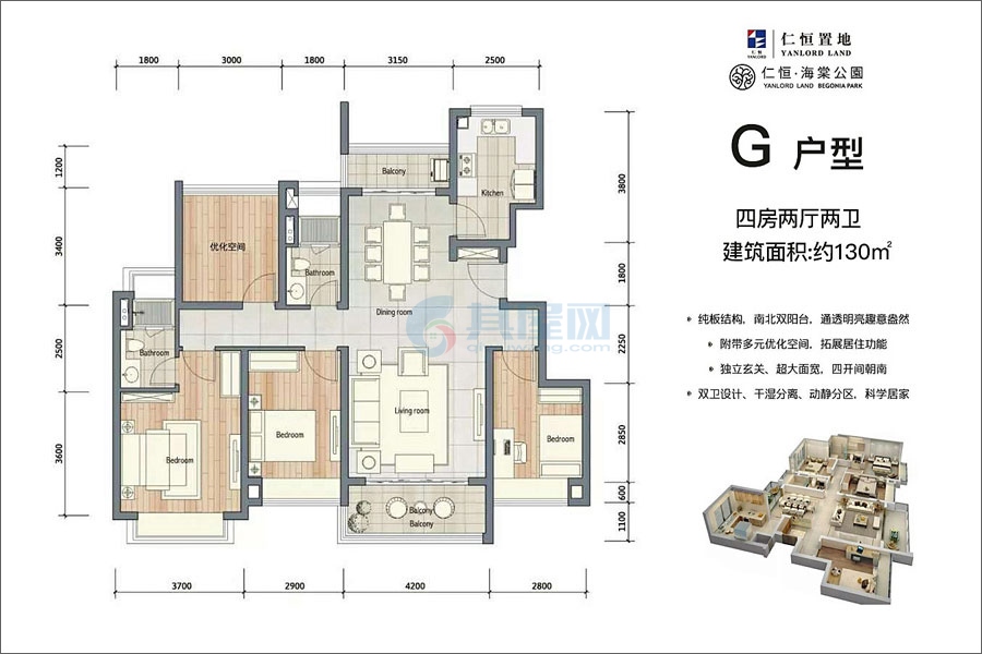 G户型-建面约130.00㎡-4房2厅2卫