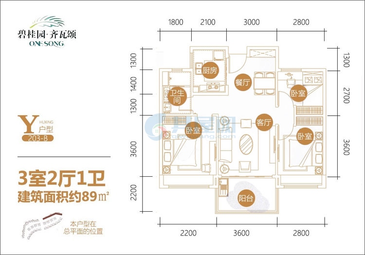 Y203-B户型-建面约89.00㎡-3房2厅1厨1卫