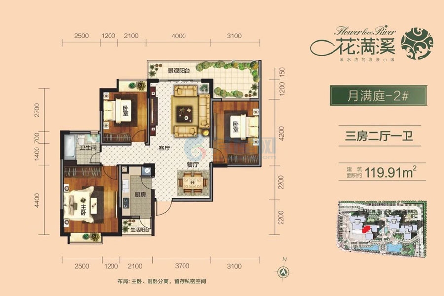 花满溪舒适三房户型在售 ,建面为116平米、119平米,单价约15500元/平,首付54万/套